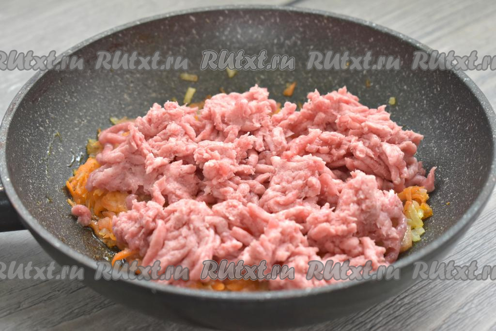 К обжаренным овощам выкладываем мясной фарш, перемешиваем.