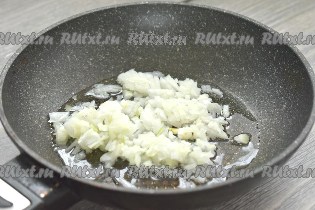 Разогреваем в глубокой сковороде растительное масло, выкладываем мелко нарезанную луковицу и обжариваем её минуты 3-4 (до мягкости) на среднем огне, иногда помешивая.