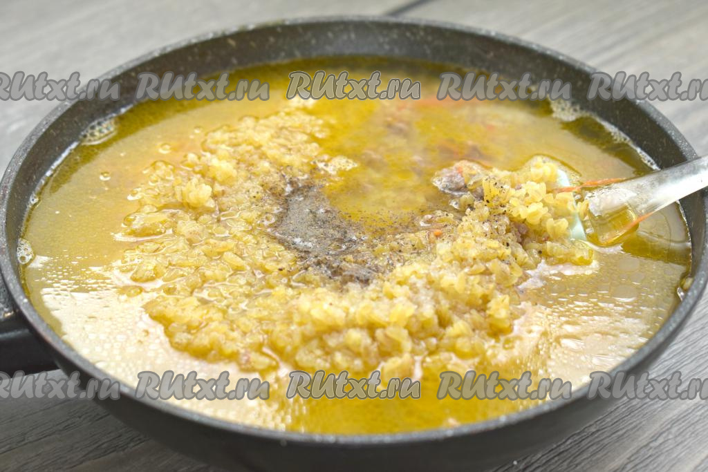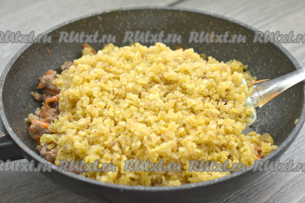 К овощам и фаршу выкладываем булгур.