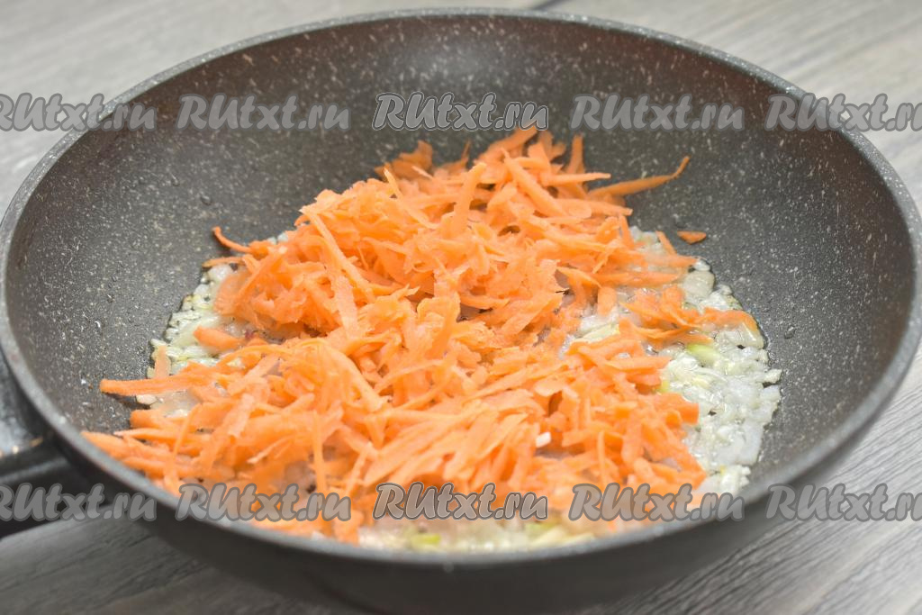 К обжаренному луку выкладываем морковь, натёртую на крупной тёрке, сразу перемешиваем и обжариваем овощи вместе 4-5 минут (до мягкости моркови), периодически перемешивая.