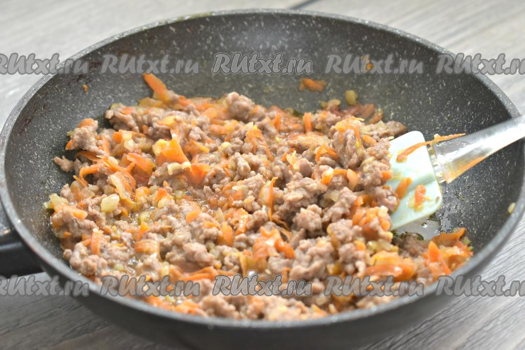 Обжариваем мясо с овощами 5-7 минут (до изменения цвета мяса), разбивая лопаткой комочки фарша.