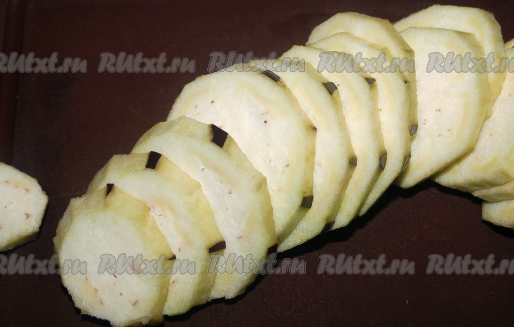 Баклажан очистить от кожицы, нарезать тонкими кружочками.