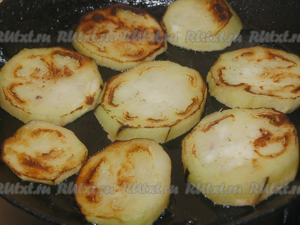 Обжарить кружочки баклажана на растительном масле на среднем огне с двух сторон до подрумянивания, а затем переложить на тарелку.