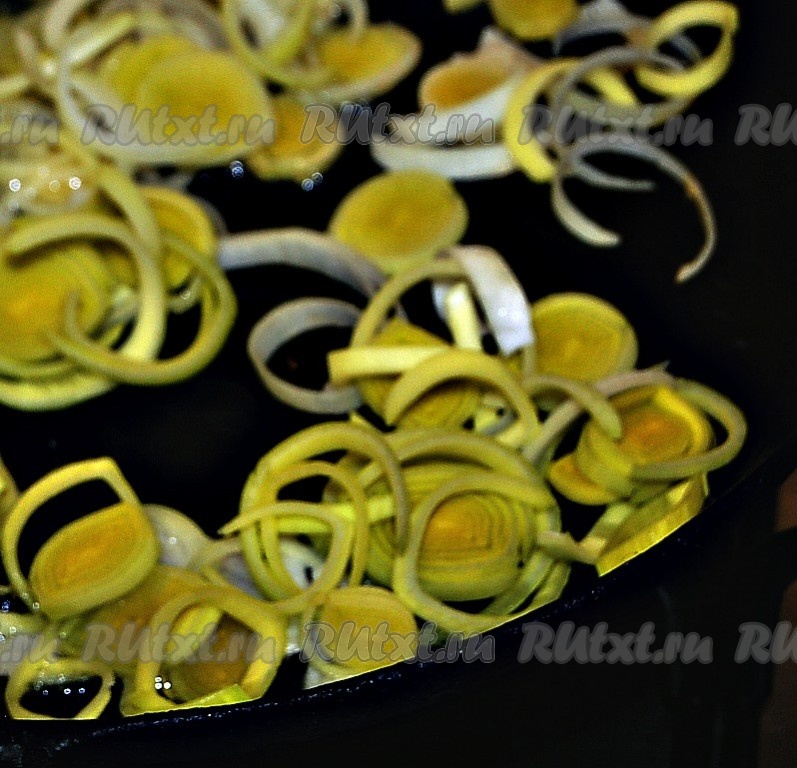 Тарелку с баклажанами отставить в сторонку, а на этой же сковороде на среднем огне в течение 5 минут обжарить очищенный и нарезанный лук (я нарезала лук порей колечками, репчатый лук можно нарезать полукольцами или четверть кольцами), не забывая помешивать время от времени.