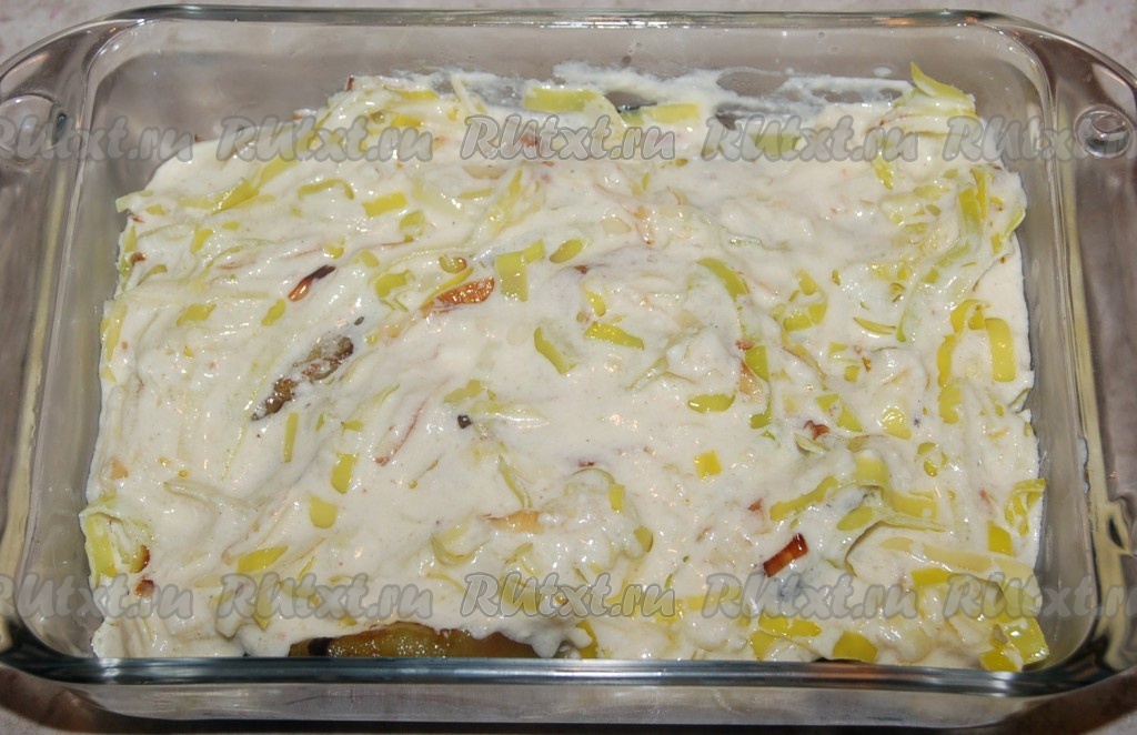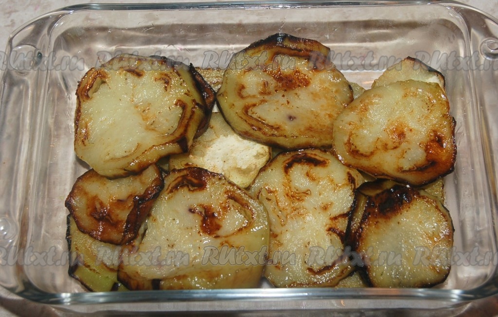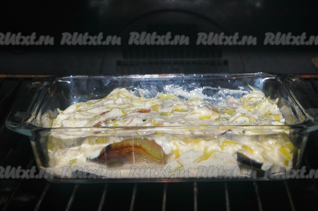 Обжаренные баклажаны выложить в форму для запекания и залить приготовленным сырным соусом.