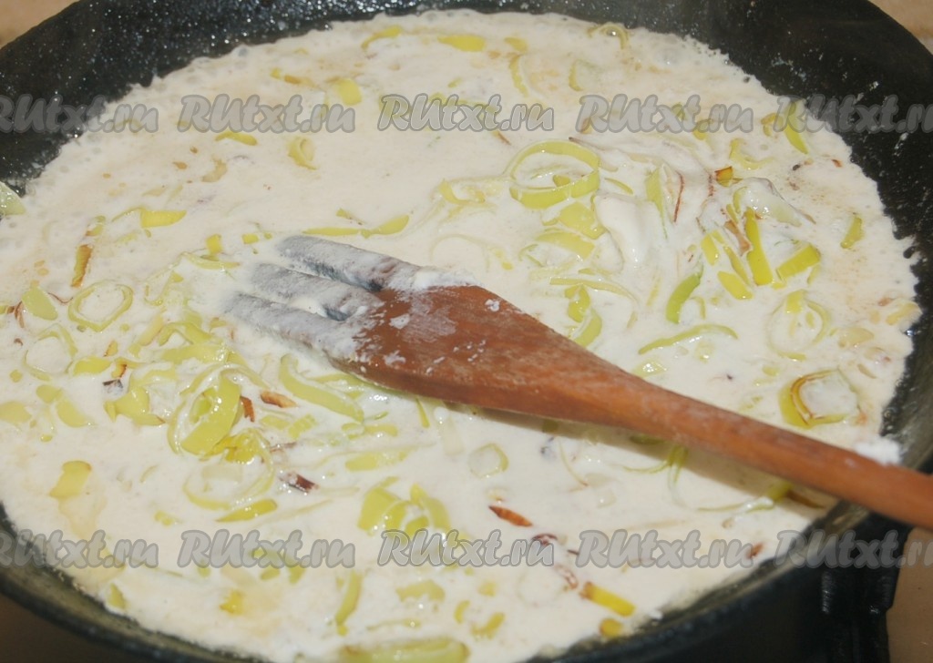 Затем влить сливки, соль, чёрный молотый перец и тушить, помешивая, 5-7 минут.