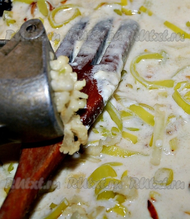 В конце тушения добавить пропущенный через прсс чеснок, перемешать и снять получивший соус с огня.