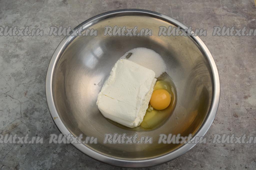 В глубокую миску выложить обезжиренный творог, сахар и сырое яйцо.