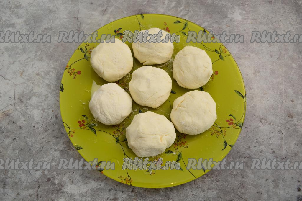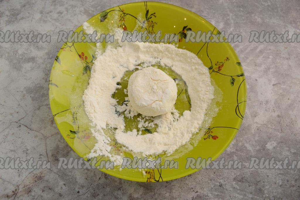 На отдельную тарелку насыпать 2 столовых ложки муки. Зрительно разделить творожное тесто на равные части (я разделила на 7 равных частей). Влажными руками сформировать округлую заготовку сырника из одной части теста и обвалять со всех сторон в муке.