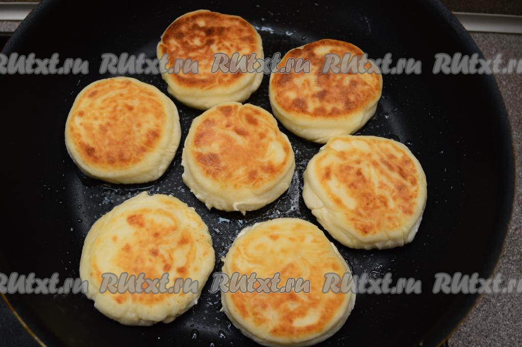 На сковороде хорошо разогреть растительное масло, выложить наши заготовки сырников и жарить их до румяности снизу (ориентировочно в течение 3-4 минут).