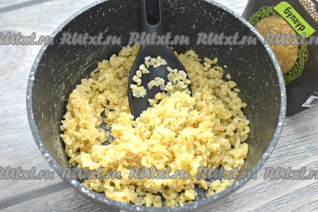 Булгур перекладываем в кастрюлю с толстым дном и заливаем 100-120 миллилитрами кипящей воды, ставим на огонь, после закипания, периодически перемешивая, варим 10 минут. Булгур будет отварен до полуготовности, сливаем лишнюю воду, если она есть. Даём булгуру остыть.