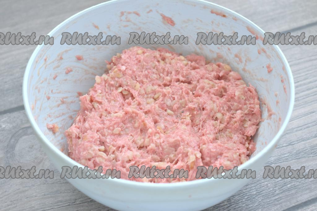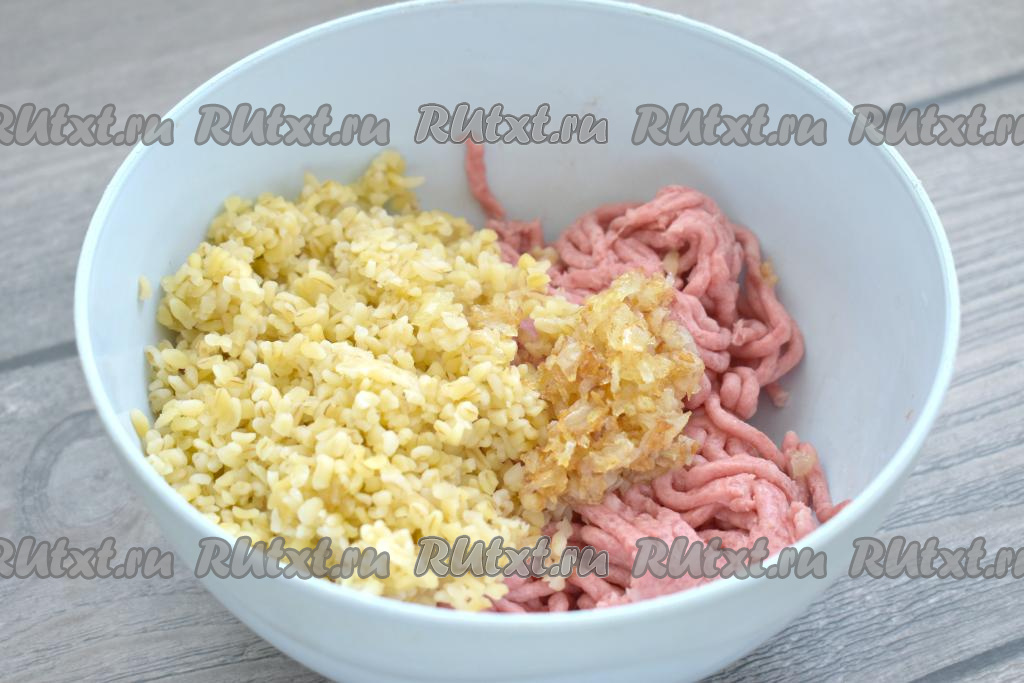 Кусочки мяса (у меня - свинина, но можно взять и, например, куриное филе, говядину или индейку) пропускаем через мясорубку в глубокую миску. При желании можно взять и покупной фарш. В миску с фаршем выкладываем остывшие булгур и лук.