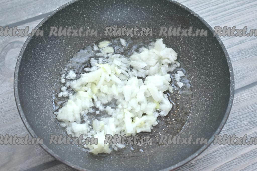 Очищаем и мелко нарезаем луковицу. Разогреваем на сковороде растительное масло, выкладываем лук и обжариваем его на среднем огне до мягкости (ориентировочно в течение 3-4 минут), периодически помешивая. Затем, убрав с огня, даём луку немного остыть.