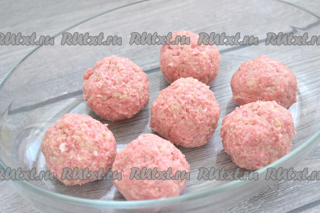 Слегка смачиваем ладони водой и формируем из фарша круглые тефтели (у меня получилось 7 штук), выкладываем их в форму для запекания.