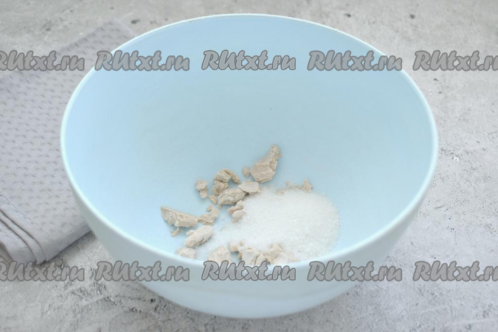 Миску для замешивания блинного теста на живых дрожжах выбирайте глубокую, вместительную. Итак, живые дрожжи крошим и помещаем в миску, добавляем сахар.