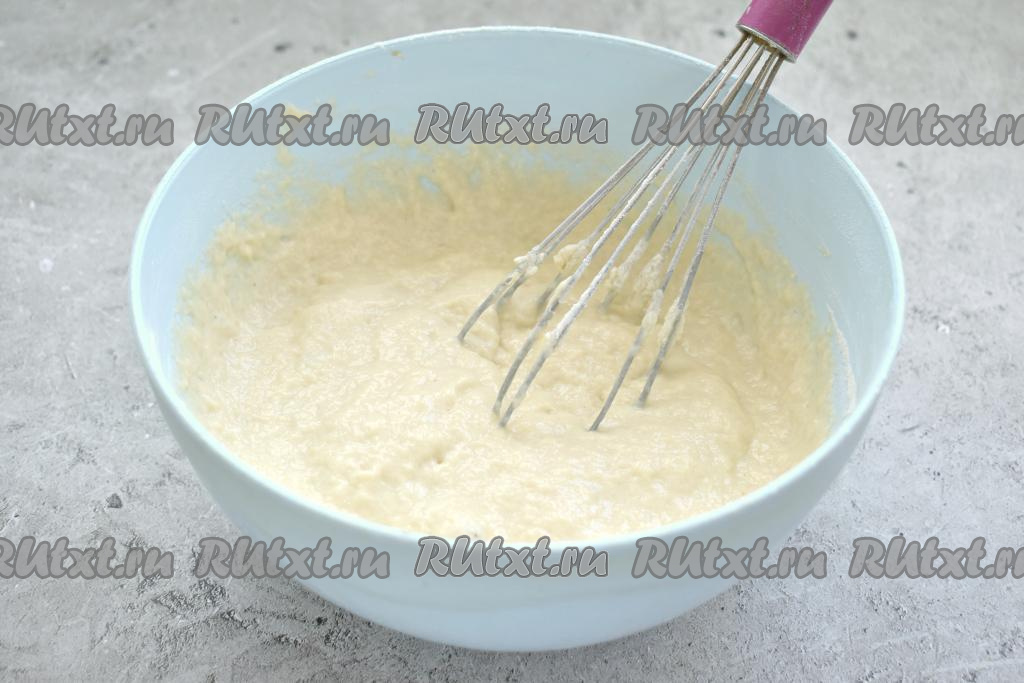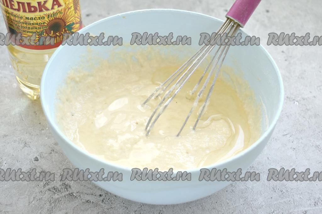 В тесто вливаем растительное масло и тщательно перемешиваем венчиком.