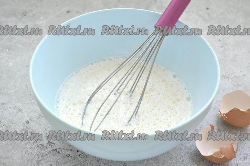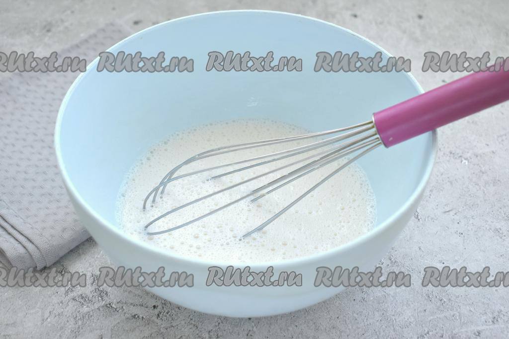 В эту же миску вливаем 250 миллилитров тёплого молока (примерная температура молока 38-39 градусов). Хорошо перемешиваем венчиком, чтобы дрожжи полностью растворились в молоке. Оставляем дрожжевую смесь в тепле на 10 минут, чтобы дрожжи активировались.