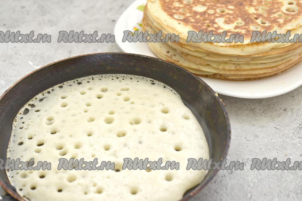 Накрываем миску с блинным тестом крышкой и ставим в тёплое место примерно на 1 час. В течение этого времени через каждые 15 минут перемешивайте тесто, поскольку оно сильно увеличивается в размере.