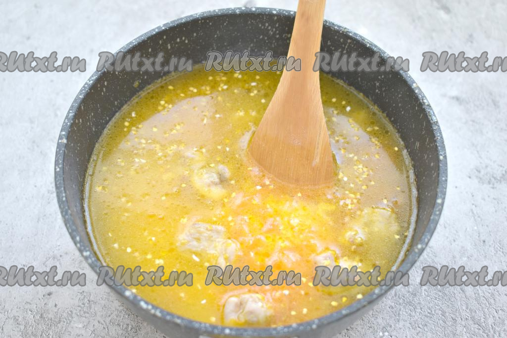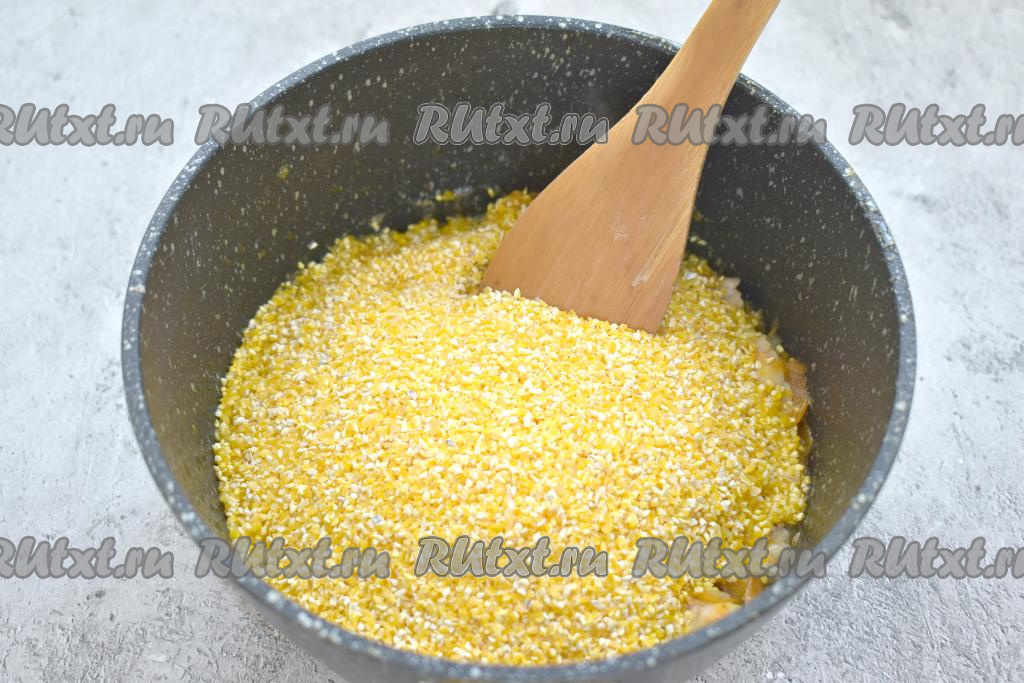 По прошествии 10 минут к курице, протушившейся с овощами, всыпаем кукурузную крупу.