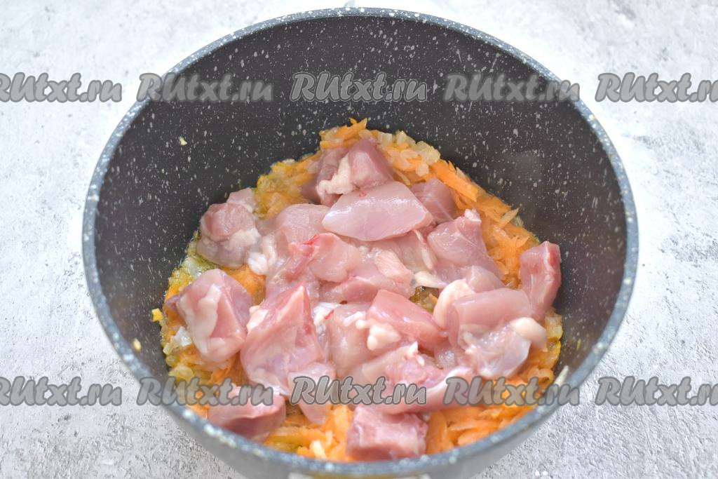 Для этого блюда можно взять мясо, срезанное с любых частей курицы (я взяла куриный окорочок, сняла с него кожу и отделила от костей). 300 грамм мяса нарезаем на небольшие кусочки, добавляем к обжаренным овощам, перемешиваем, обжариваем 5 минут, иногда перемешивая.