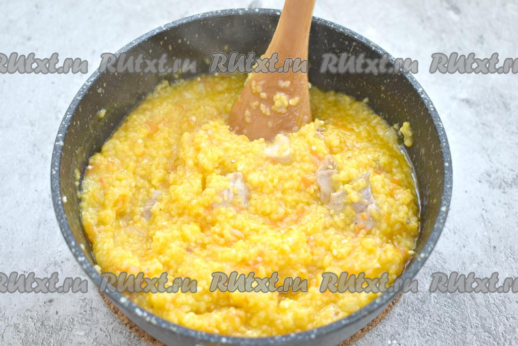 После закипания делаем огонь минимальным, кастрюлю накрываем крышкой и варим кукурузную кашу с курицей 20 минут (до мягкости крупы). За это время 3-4 раза кашу перемешиваем.