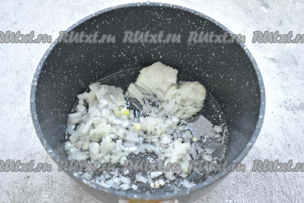 Очищаем луковицу и морковь. Готовить кукурузную кашу с курицей лучше в кастрюле с толстым дном, подойдёт также сотейник или глубокая сковорода. Разогреваем в кастрюле (или в сковороде, или в сотейнике) растительное масло, выкладываем лук, нарезанный на маленькие кусочки, и обжариваем его на среднем огне, периодически перемешивая, до прозрачности (в течение 3-4 минут).
