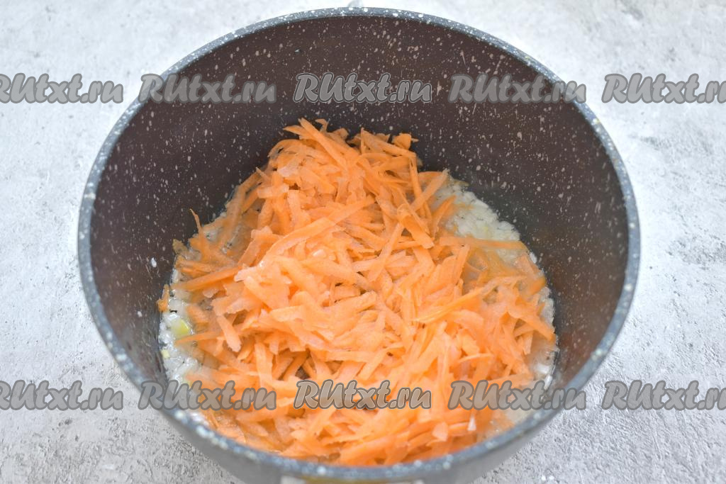 К обжаренному луку выкладываем натёртую на крупной тёрке морковь, перемешиваем и обжариваем 4-5 минут (морковка должна стать мягкой).