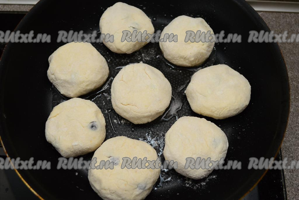 В сковороде хорошо прогреть растительное масло, после этого выложить заготовки сырников, слегка прижимая из сверху ладонью. Жарить сырники с чёрной смородиной на среднем огне до подумянивания с двух сторон (минуты по 2-3 с каждой стороны).