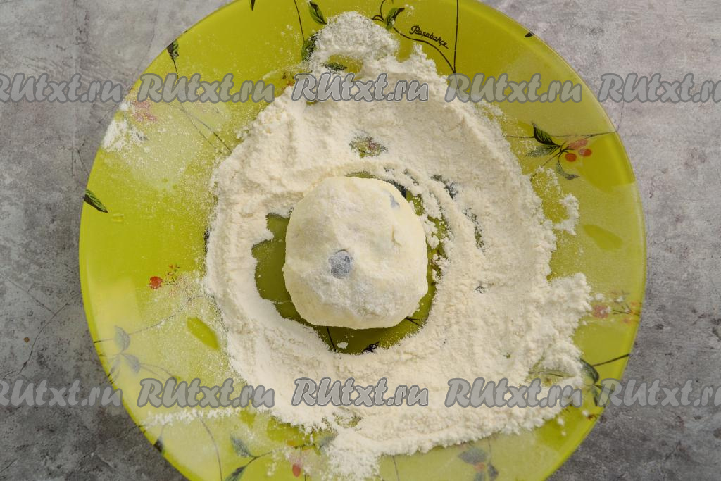 Творожное тесто со смородиной зрительно разделить на 8 равных частей. Вначале из одной части теста влажными руками сформировать круглую заготовку сырника. На плоскую тарелку насыпать 2 столовых ложки муки. Круглую заготовку сырника обвалять со всех сторон в муке.
