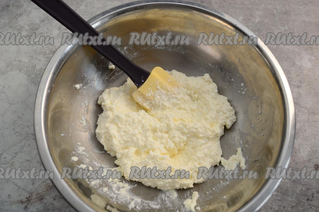 Перемешать сахар, творог и яйцо до однородности, хорошо растирая творожную массу лопаткой (или вилкой).