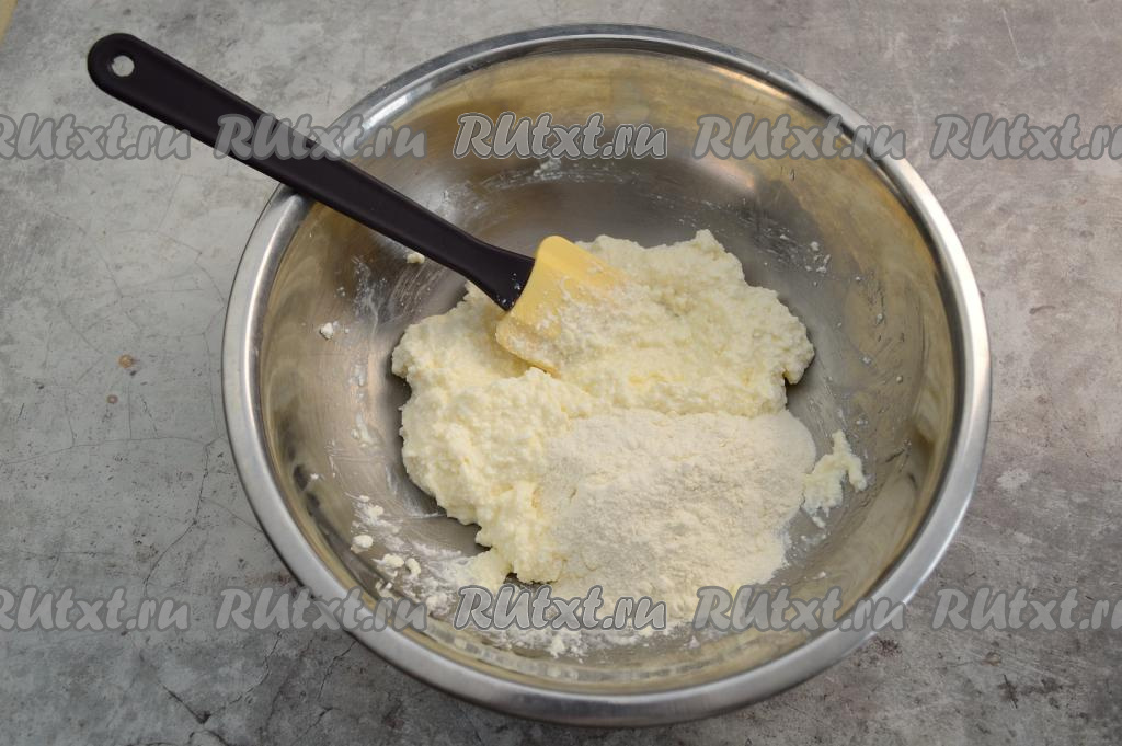 Всыпать половину (примерно 2 столовых ложки) муки, перемешать творожное тесто лопаткой до однородности.