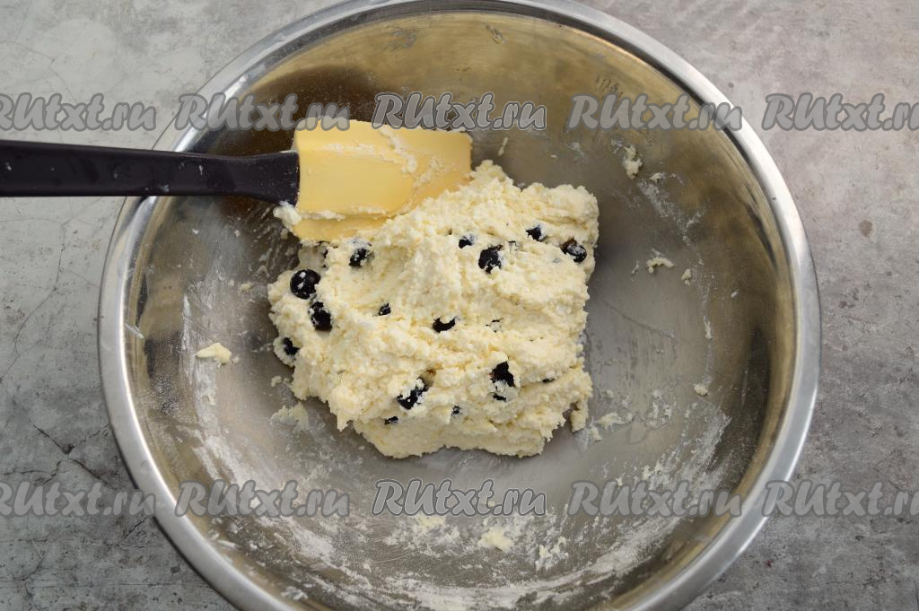 Всыпать в миску замороженную или свежую смородину. Аккуратно вмешать ягоды в тесто, чтобы они не повредились. Начать добавлять по 1 столовой ложке оставшуюся муку, аккуратно вмешивая её в тесто.