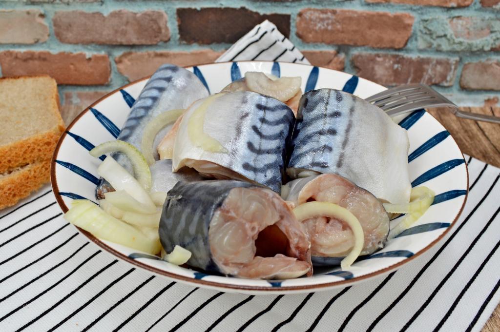 Через 24 часа можно снимать пробу. Кусочки скумбрии получаются малосольными, лук тоже становится очень вкусным, он очень похож на маринованный, хотя рыбка готовилась только в рассоле, без добавления уксуса.