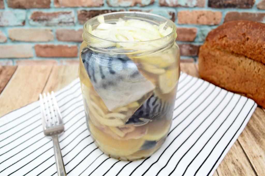 В банку с луком и скумбрией влить остывший рассол, заполняя баночку до самого верха. Накрыть банку крышкой и убрать рыбу засаливаться на сутки в холодильник.