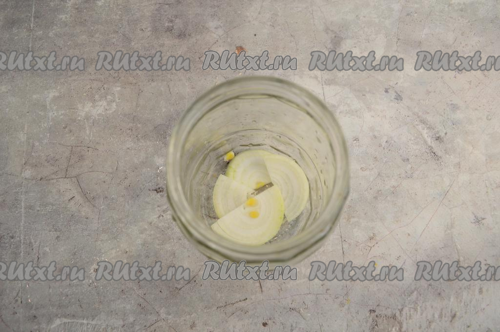 В чистую банку (я взяла банку объёмом 800 миллилитров) выложить слой лука.