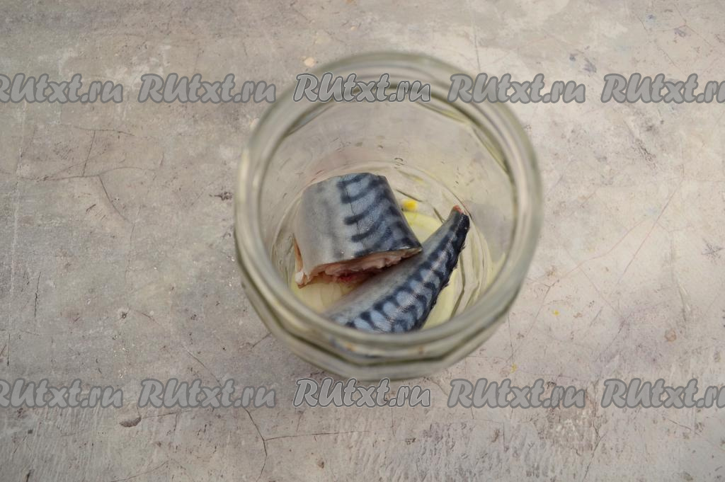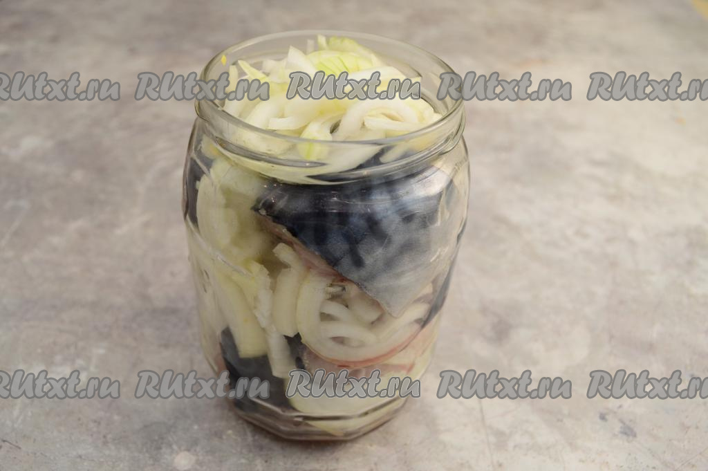Так, чередуя слои лука и скумбрии, заполнить банку до самого верха. Последним слоем должен быть лук.