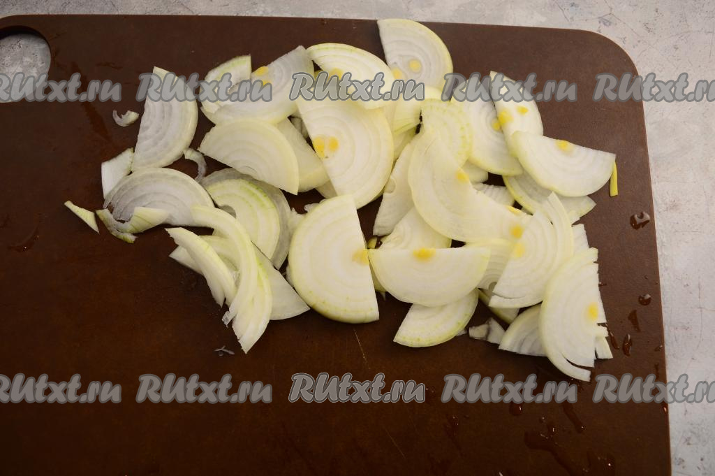 Лук очистить, промыть и нарезать на тонкие полукольца.