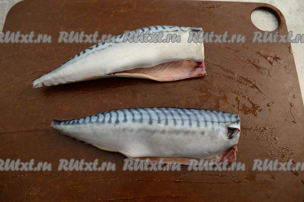 У размороженной скумбрии отрезать хвост, голову, плавники. Разрезать брюшко каждой рыбы, удалить внутренности, хорошо промыть и снять чёрную плёнку внутри брюшка.