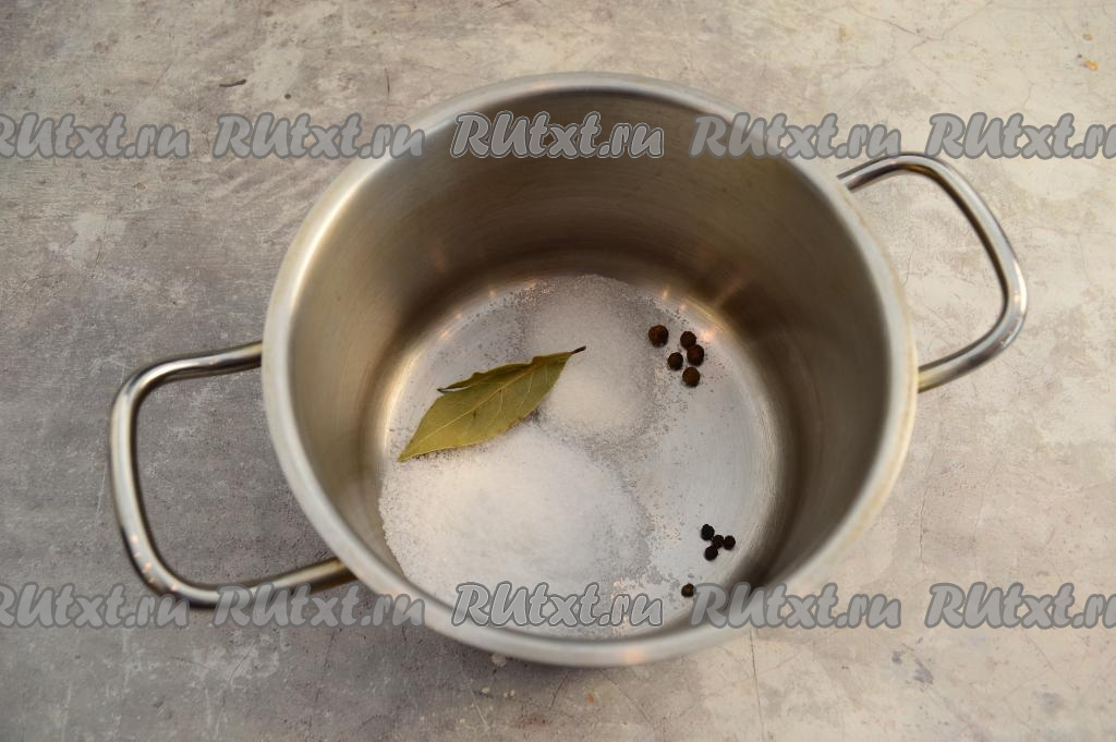 Прежде всего сварим рассол, для этого в кастрюлю нужно всыпать сахар и соль, добавить лавровый лист, горошины чёрного и душистого перцев, влить 300 миллилитров воды, поставить на сильный огонь. Как только рассол закипит, сделать огонь ниже среднего и проварить минуты 2-3 (до растворения сахара и соли), иногда перемешивая. Затем выключить огонь, накрыть кастрюлю крышкой и оставить рассол остывать до комнатной температуры.