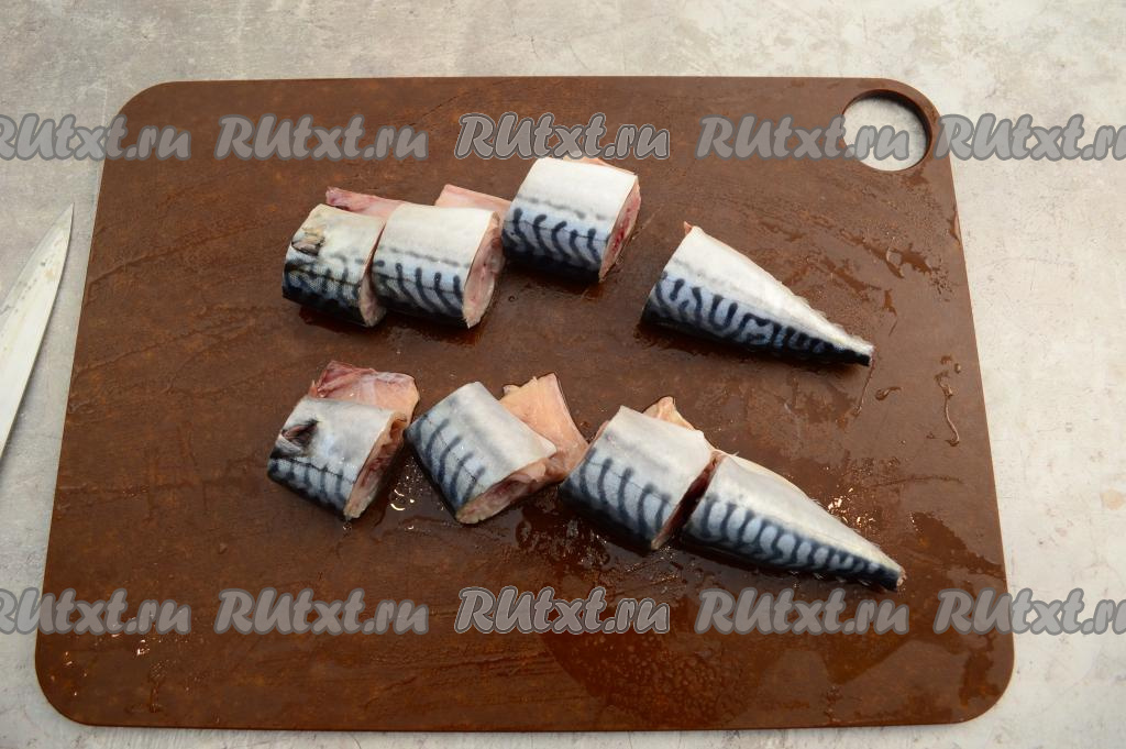 Разрезать скумбрию на порционные кусочки шириной 3-4 сантиметра.