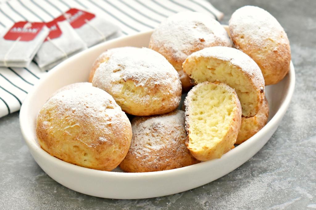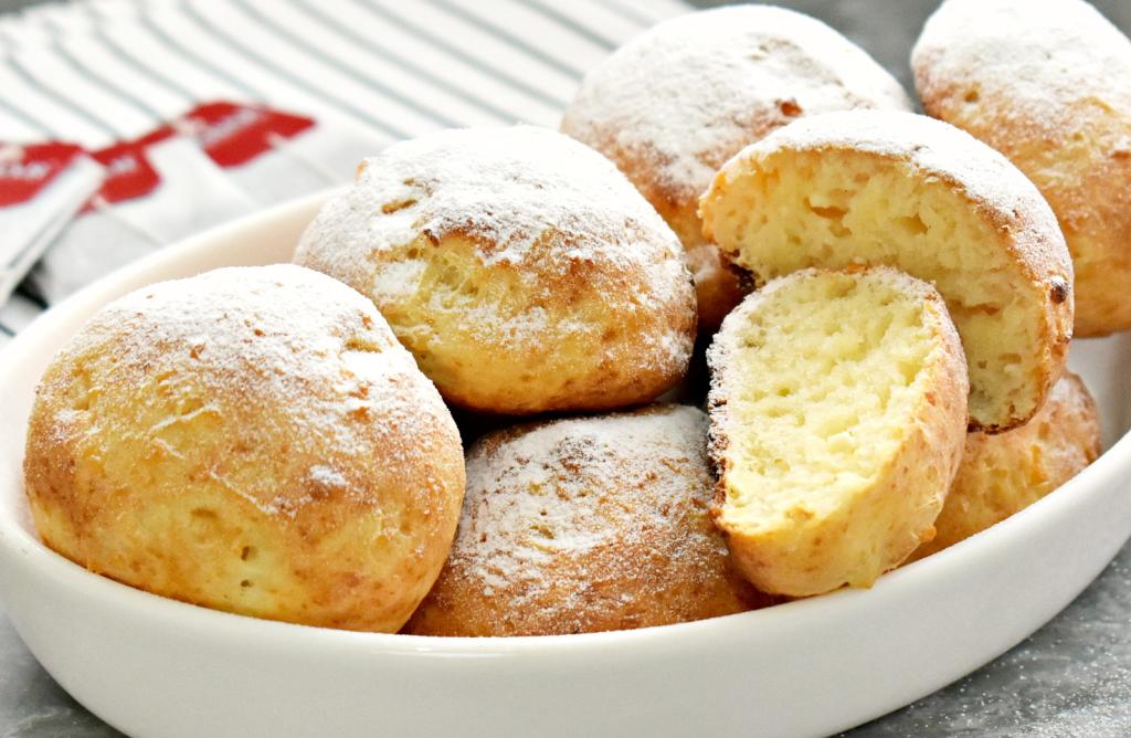 Готовые пончики из творога достаём из духовки, даём остыть и посыпаем их сверху сахарной пудрой. Вкусные, пышные, мягкие внутри творожные пончики станут прекрасным дополнением к чаю.