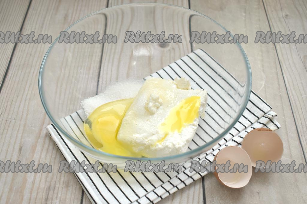 В миску с творогом и сахаром добавляем яйцо.