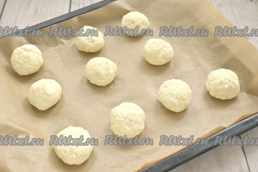 Противень застилаем пергаментом. Смачивая руки водой, из каждого кусочка творожного теста скатываем шарик и выкладываем на застеленный противень. Между шариками обязательно оставляем место, ведь в процессе выпечки пончики увеличатся в объёме.