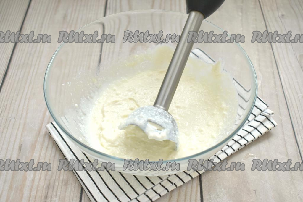Содержимое миски пробиваем до однородности погружным блендером (если нет блендера, можно растереть вилкой). Творожная масса должна получиться однородной, хотя, конечно, в ней могут быть и мелкие кусочки творога.