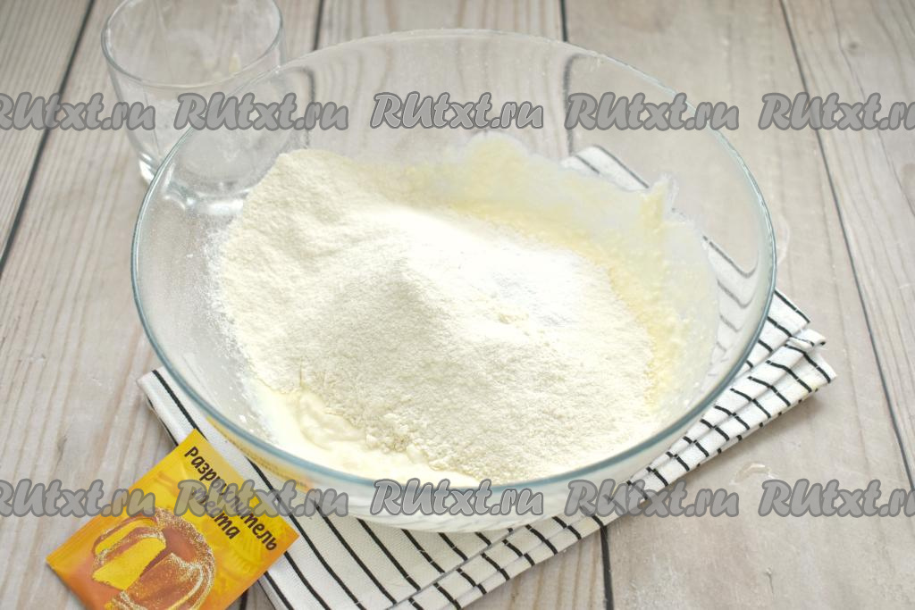 В получившуюся творожную массу просеиваем 3/4 стакана муки, добавляем разрыхлитель, перемешиваем тесто вначале столовой ложкой. А затем продолжаем замешивать творожное тесто руками, подсыпая по мере необходимости оставшуюся муку.