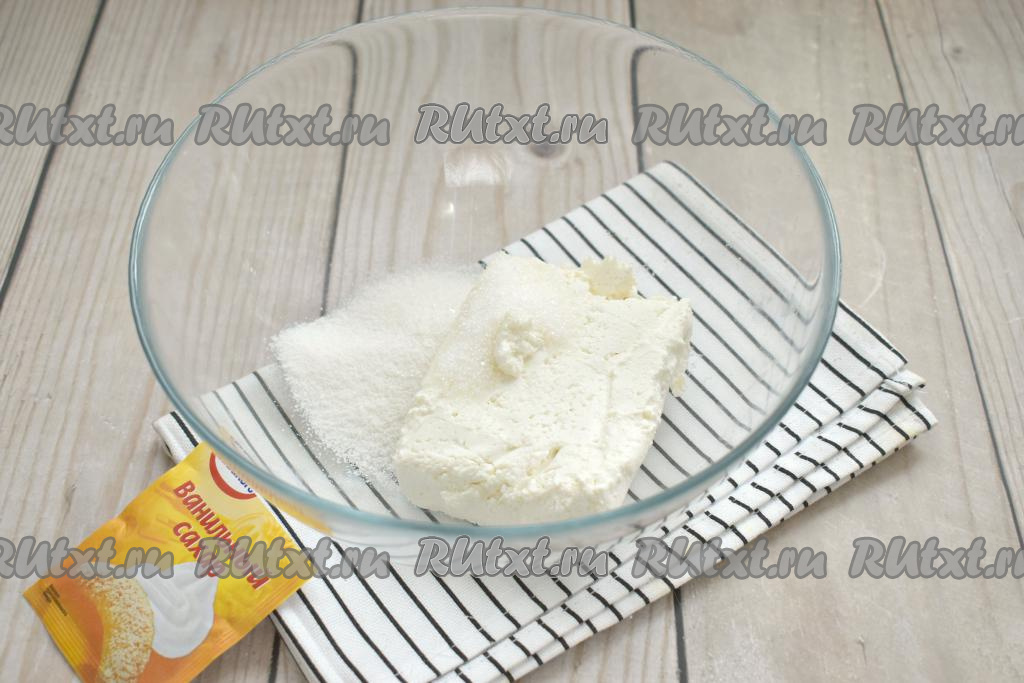Творог перекладываем в миску, добавляем обычный сахар и ванильный. Количество сахара можете регулировать по своему вкусу. С указанным количеством сахара готовые пончики получаются не слишком сладкими, но при подаче они посыпаются сахарной пудрой.
