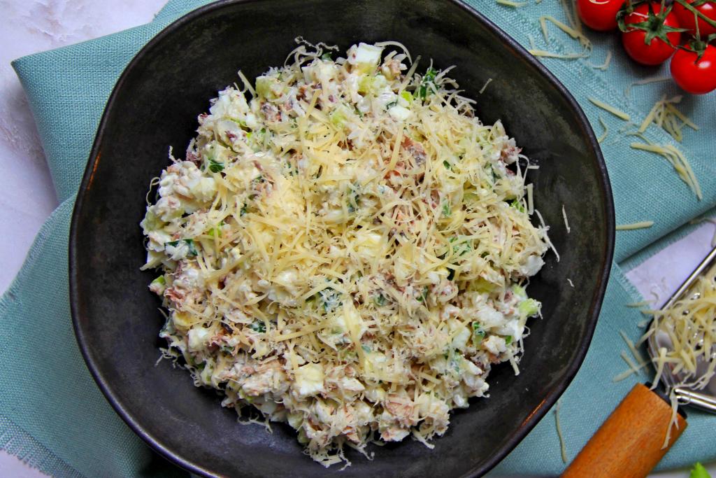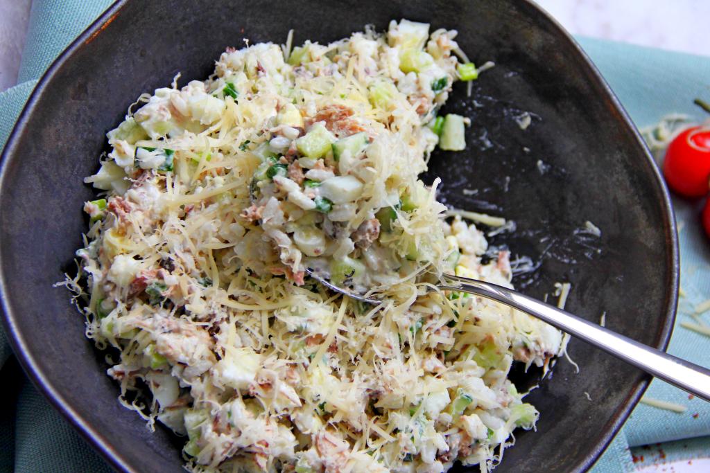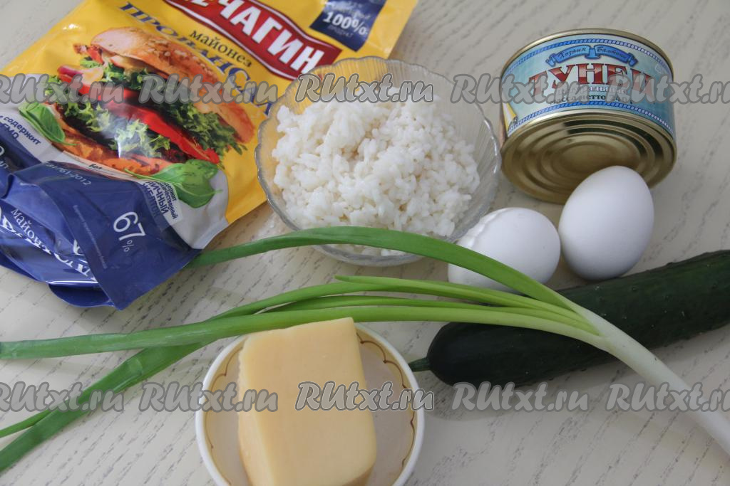 Существует немало вариантов приготовления салатов с рыбными консервами. В этот раз решила подать к столу салат из консервированного тунца, риса, свежего огурца, яиц и сыра. Блюдо получается нежным, очень вкусным, аппетитным и достаточно сытным. Этот салат готовится несложно, его можно подать не только к семейному обеду или ужину, но и к праздничному столу.