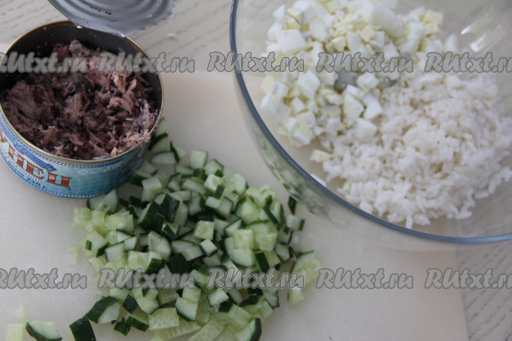 Яйца добавить в салатник с рисом. Нарезать огурец на мелкие кубики. С тунца слить лишнюю жидкость, затем размять рыбу вилкой.