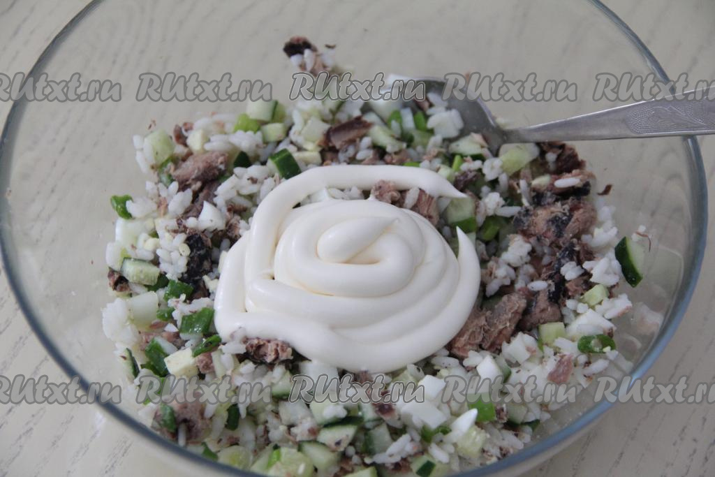 В салатник с рисом и яйцами добавить огурец, консервированного тунца и мелко нарезанный зелёный лук, посолить салат.
