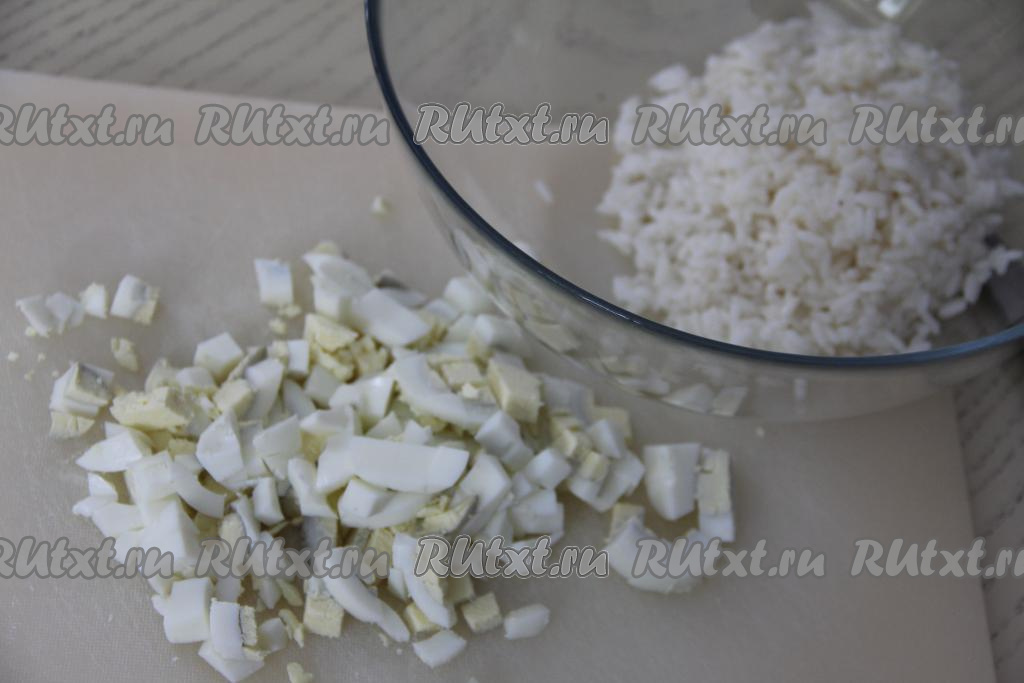 Подготовить продукты. Рис промыть водой, выложить в кастрюлю с уже закипевшей подсоленной водой и варить с момента закипания минут 20 (до готовности, то есть рисинки должны стать мягкими, но не переваренными), а затем откинуть на дуршлаг, чтобы убрать лишнюю воду). Отварить яйца в течение 10 минут после начала кипения воды, дать им остыть, очистить. Вымыть огурец и зелёный лук.